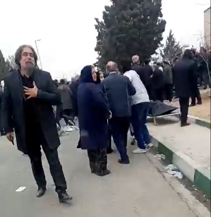A still image from a smuggled video: A man overwhelmed by grief clutches his chest on a city street in Iran. Behind him people search for the bodies of loved ones killed in the protests.
